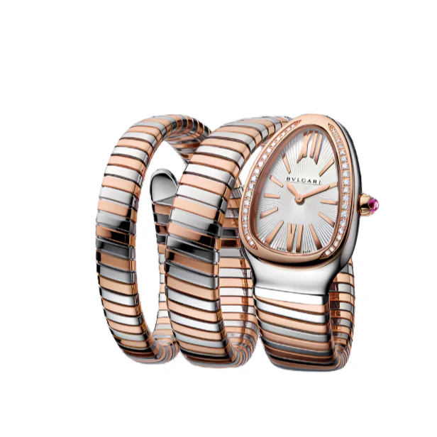 Crafted with a stainless steel case and dual-spiral pink gold and steel tubogas bracelet, the Serpenti Tubogas watch exudes luxury and sophistication. The fixed 18k pink gold bezel adds a touch of elegance to the silver opaline dial with guilloche soleil treatment. The dial features pink gold-tone hands, index hour markers, and Roman numerals at the 6 and 12 o'clock positions. Powered by a Bvlgari Calibre B033 quartz movement, this watch is both precise and reliable. Protected by a scratch resistant sapphire crystal, this watch also features a pull/push crown and a solid case back. With a case size of 35 mm and water resistance up to 30 meters/100 feet, this timepiece is perfect for everyday wear. The Serpenti Tubogas is truly a must-have for those who seek a luxurious Swiss-made watch